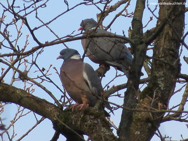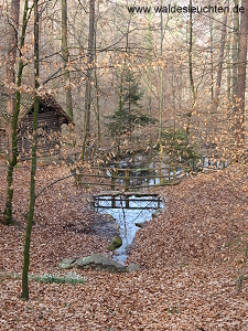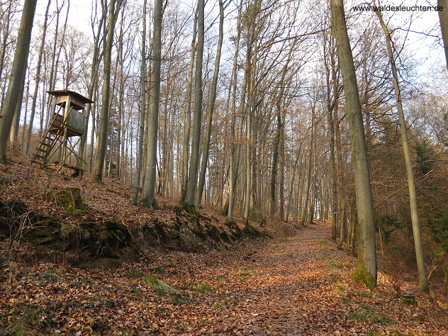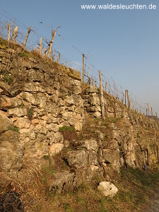 Man kann diese kleine Wanderung – oder großen Spaziergang – beispielsweise am Parkplatz an der Turnhalle von Großheppach beginnen; diese liegt am Ende der Zügernbergstraße unter den Weinbergen. Dann geht man die Straße weiter hinauf in den Weinberg, links liegen die Friedrich-Schiller-Grundschule und die neuerbaute Kindertagesstätte, rechts liegen Turnhalle, Sport- und Tennisplätze. Hinter den Tennisplätzen folgen ein paar Streuobstwiesen, dann führt ein Weg nach rechts/ Osten durch die Weinberge Richtung Gundelsbach. Die Weinberge liegen noch im Winterschlaf, die Knospen sind noch klein, das Gras zwischen den Reben braungrün ohne frischen Austrieb. Aber die ersten Stare fliegen schon, man hört ihren charakteristischen, etwas quetschenden Gesang mit zahlreichen eingestreuten Nachahmungen anderer Vogelrufe, auch solche von Arten, die nur im Winterquartier der Stare vorkommen. Immer wieder auch die üblichen, pechschwarzen Rabenkrähen, die sich in den letzten Jahren stark vermehrt haben. Folgt man diesem asphaltierten/ betonierten Weinbergweg, kommt man zu einer Weggabelung „am Stein“, wie wir es nennen. Ein großer Felsbrocken erinnert in einer Aufschrift an den ersten und zweiten Teil der Rebflurbereinigung Ende der 60er/ Anfang der 70er Jahre. Davor steht eine Bank, auf der man rasten kann, wenn man möchte, denn nun folgt ein etwas steilerer Anstieg hinauf auf den Weinberg, nach Norden, immer noch einer Weinbergstraße folgend. Am Himmel kreisen zwei Mäusebussarde und lassen ihre gezogen miauenden Rufe ertönen. Man steigt hier nicht ganz hinauf, der dritte Querweg im Anstieg (denjenigen direkt an der Bank nicht mitgezählt) führt nach rechts in die Streuobstwiesen. Hier ist es immer menschenleer und idyllisch. Ist man am frühen Morgen oder späten Abend unterwegs, kann man fast immer Rehwild entdecken, manchmal auch Schwarzwild. Heute, mitten am Tag, muß ich mich mit diversen Vögeln begnügen, vor allem zahlreichen Kohlmeisen und Amseln. Aber es ertönt auch die leise, fragende Strophe des Gartenbaumläufers und das laute Lachen des Grünspechts. Lange schon bin ich hier nicht mehr gewesen, erinnere mich an meine Teenagerzeit. Damals hatte ich Aiko noch nicht, war noch mit meinem ersten, sehr schwierigen Hund unterwegs, den wir aus dem Tierheim geholt hatten, einem Labrador-Dobermann-Mischling. Schön führt der Wiesenweg weit oberhalb von Gundelsbach entlang, hin und wieder kann man einen Blick auf die wenigen Häuser erhaschen. An einem Wasserhäuschen hält man sich links ansteigend, noch ein paar hundert Meter, dann knickt der Weg in rechtem Winkel hangaufwärts zum Wald hin ab. An diesem Waldeck öffnen sich die Buchen über dem Waldeingang wie ein Tor. Auch der Wald ist noch kein Frühlingswald; die Bäume sind kahl, Massen von trockenem Laub bedecken den Boden. Auch hier kann man am Morgen oder Abend oft Rehwild beobachten; auch hier bleibt es heute jedoch unsichtbar. Ein Eichelhäher rätscht, weil er sich durch mich gestört fühlt; an einer Fichtenpflanzung im sonstigen Buchenmischwald schaut eine Haubenmeise auf mich herunter und verschwindet im Grün. Nach einem kurzen Anstieg durch dieses eher schattig-feuchte Waldstück erreiche ich eine gekieste Forststraße und gehe auf ihr nach Norden. Rechts des Weges liegt eine gern von Wildschweinen besuchte Suhle, oben in den Baumkronen fliegen ein paar größere Vögel. Ein Blick durchs Fernglas: Ringeltauben. Wieder folgt eine kleine Fichtenpflanzung, ein dunkler Fleck im lichten Vorfrühlingswald; bei Nebel ist dies eine ganz besondere Stelle. Wenn die Sonne allmählich höher steigt und die Kraft hat, den Nebel zu brechen, fällt sie genau hier in Strahlen durch die Fichtenzweige und taucht den Wald in ein märchenhaftes Licht; man geht wie auf einem verwunschenen Weg durch einen Zauberwald, fühlt sich gesegnet und beschenkt. Dieses Lichterlebnis gab diesem Blog seinen Namen. Heute freilich ist ein sonniger Tag ohne Nebel, und diese besondere Stelle wirkt ganz alltäglich. Nach einigem Gehen, leicht bergab, erreicht man auf diesem Weg einen Waldspielplatz an einer Weggabel, das „Beinsteiner Seele“ (See-le), auch „Seespielplatz“ und „Wasserrädle“ genannt. Hier entspringt eine Quelle, das Wasser fließt in ein Brunnenbecken und über ein Wasserrad in einen kleinen Teich, um sich als schmales Bächlein ins Tal hinab zu ziehen. Ein zweiter kleiner Teich wird von einem hölzernen Schiff gesäumt, das freilich seine besten Zeiten schon lange hinter sich gelassen hat. Mich links haltend, gehe ich auf der Forststraße ganz leicht bergan. Laut ertönen die Rufe des Kleibers, erstaunlich laut für einen doch eher kleinen Vogel; hin und wieder schmettert ein Buchfink seine Frühjahrsstrophe. An der nächsten Weggabel halte ich mich wieder links, nun geht es wieder etwas stärker bergan in südliche Richtung. Doch schon der übernächste Abzweig nach rechts ist der Richtige; ein schmalerer Weg führt durch nur halbhohen Wald. Sieht man zur Rechten eine Hütte liegen, ist man schon zu weit gegangen und hat den Abzweig verpaßt. Weihnachten 1999 hatte der Orkan Lothar hier den kompletten Fichtenwald niedergelegt. Kein Baum stand mehr, nur einzelne gesplitterte Stämme ragten noch wie überdimensionale Zeigerfinger, als Mahnung erhoben, aus dem Baumwirrwarr gegen den Winterhimmel. Der Anblick war schlimm; die Tränen ließen sich damals nicht ganz unterdrücken. Gerade an diesem Fichtenbestand mit seinem weichen Nadelweg hingen Erinnerungen an diverse Ausritte und Sichtungen von Rehwild an stillen Tagen… Es wurde nicht mehr mit Fichten aufgeforstet; nun entwickelt sich hier ein Mischwald, der aber derzeit noch von Birken und Holunder geprägt wird. Einzelne Stechpalmen wachsen hier ebenfalls, aber man sieht sie nur, wenn man es weiß; sie stehen etwas abseits der Wege. Wieder entdecke ich in den Baumkronen Ringeltauben, gehe immer weiter den Krümmungen des Weges folgend mehr oder weniger geradeaus, a